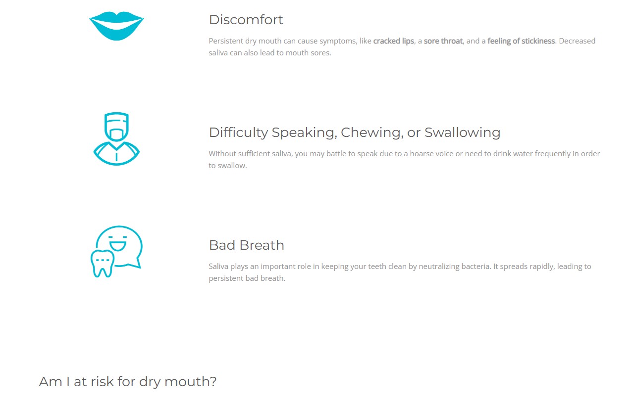 Constant dry mouth can cause bad breath, affect your sense of taste. It can also make chewing and swallowing more difficult.