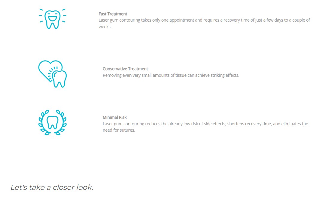 Anesthesia is used to completely numb the treatment area. Sedation can provide further comfort for anxious patients. With advanced soft tissue lasers, the procedure is more comfortable than ever before. The tool seals tissue as it works, which results in minimal bleeding and inflammation. Compared to traditional methods involving a scalpel, laser gum contouring involves very little recovery time.