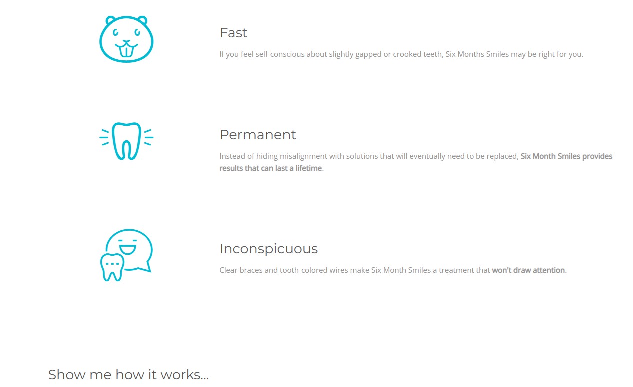Six Month Smiles uses the same basic concept as traditional braces, but with some key differences. Brackets and wires are used to gradually move the teeth, but instead of aligning your entire bite, this treatment focuses only on the teeth that show when you smile. Because the brackets are clear and the wire is tooth-colored, you don’t have to worry about your hardware taking center stage during treatment .