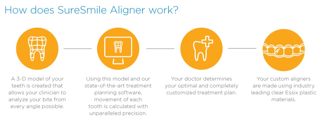 SureSmile Aligner is a series of transparent, removable and virtually invisible clear aligners designed to progressively straighten your teeth into their ideal position.